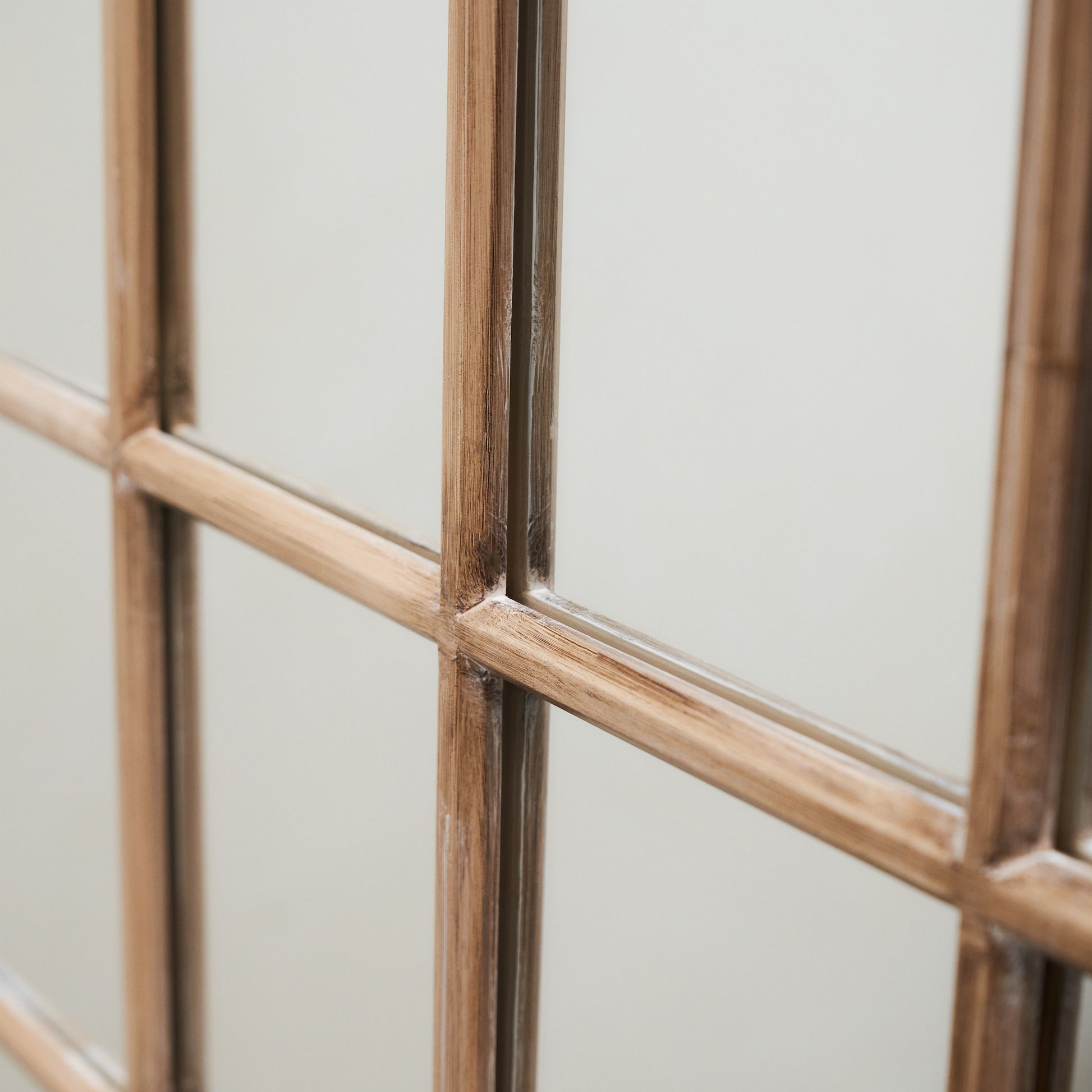 Sa structure artisanale présente un cadre en chêne vieilli soigneusement superposé sur une vitre continue, créant 24 panneaux réfléchissants qui capturent l'esprit des anciennes verrières de maison de campagne. C'est la solution idéale pour ceux qui recherchent une touche de nostalgie élégante et une sensation d'ouverture accrue dans un salon, une chambre ou une entrée spacieuse.